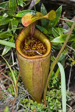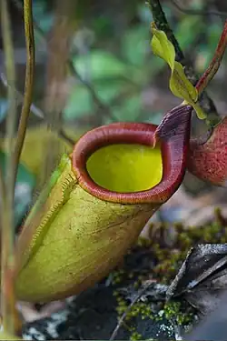 Rosette and lower pitchers are wholly ovate to urceolate. They grow up to 20 cm high by 7 cm wide. A pair of wings up to 12 mm wide runs down the ventral surface of the pitcher cup. These wings bear filiform fringe elements up to 10 mm long. The pitcher mouth is oval to circular and up to 6 cm across. It has an oblique insertion and rises at the rear to form a conspicuous neck. The peristome is cylindrical to slightly flattened and up to 2 cm wide for most of its length, becoming broader towards the neck (≤3 cm wide). It bears ribs up to 2 mm high and spaced up to 2 mm apart, which terminate in teeth (≤4 mm long) on the peristome's inner margin. The digestive zone usually covers the entirety of the pitcher's inner surface. The pitcher lid or operculum is elliptic and measures up to 6 cm in length by 4.5 cm in width. It lacks appendages or a keel. A spur is inserted near the base of the lid. It measures up to 9 mm in length, with a basal diameter of up to 2 mm, although it may be much smaller.[2]