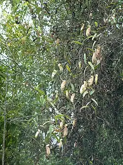 Leaves are chartaceous and sessile. The lamina (leaf blade) of young rosette plants is linear, while that of rosettes on mature plants may be greatly reduced to the point of being almost absent.[2][4] On climbing stems, the lamina is narrowly oblong-ligulate to narrowly oblanceolate. It measures up to 12 cm in length by 3 cm in width. It has an acute apex with a slightly peltate tendril insertion. The lamina is shortly attenuate at the base, clasping the stem by approximately one-third to one-half of its circumference and may or may not become decurrent as a pair of very low ridges. One to three longitudinal veins are present on either side of the midrib. Pinnate veins are inconspicuous.[5]