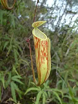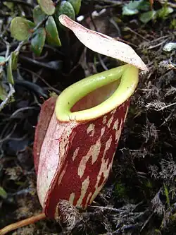 Rosette and lower pitchers are small and globose. Upper pitchers are shortly cylindrical to slightly infundibular. They grow to 14 cm in height by 3 cm in width. The wings found in aerial pitchers are distinctive in that they are well developed (≤10 mm wide) but lack fringe elements. The pitcher mouth has an oblique insertion. The peristome is cylindrical and narrow, measuring only up to 2.5 mm in width. It bears very fine ribs (0.1 mm high) spaced 0.25–0.5 mm apart. Unusually, the inner margin of the peristome lacks teeth. The pitcher lid, or operculum, is suborbicular in shape and measures up to 2.8 cm in length by 3.1 cm in width. It has a rounded to truncate apex and a truncate base. The underside of the lid lacks appendages but bears scattered nectar glands up to 0.2 mm in diameter. It shows unusual palmate nervation, with the midrib branching and connecting to the lateral veins around 1 cm below the apex. An unbranched spur (≤5 mm long) is inserted near the base of the lid.[5]