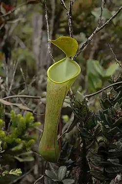 Nepenthes tentaculata /nɪˈpɛnθiːz tɛnˌtækjʊˈlɑːtə/, or the fringed pitcher-plant,[3] is a tropical pitcher plant with a wide distribution across Borneo and Sulawesi. It grows at altitudes of 400–2,550 m.[4]