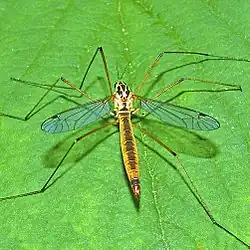 Nephrotoma cornicina can reach a body length of 12–15 millimetres (0.47–0.59 in) and a wing length of 11–15 millimetres (0.43–0.59 in).[5] On the wings the stigma is quite small, brown or black, clearly distinct. These flies have slender-bodies, with elongate an rather narrow wings and very long and slender legs. Ocelli are absent and the occipital mark is black. Flagellum is entirely black. Abdomen is mainly yellow, with a dark median stripe, sometimes absent on tergites 6 and 7. In males sternite 8 shows a straight rather long appendage directed at caudal margin. Tergite 9 is short and rather broad, swollen and rounded towards sides. The females have a pointed shiny brown ovipositor with a black basal half, for laying eggs into the ground.[6][7][8][9]