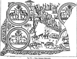 The mosaic features a plant border and four medallions with horses and in the middle a landscape scene consisting of a plain with a river and free-roaming horses, a villa with another building surrounded by animals (cow, goat, hare, birds), an eroded mountain landscape[19] with a building and a stream.[59] The villa features columns on its façade and two square towers. Deer horns are placed on the skylight[60] in a "presumably prophylactic" sense.[61] The building is semicircular and the towers have terraced roofs.[61] The building belongs to a type of villa rustica known from archaeology and iconography from the 1st to the 2nd century; the representation on the stud mosaic shows a building that is probably fairly faithful to the character's villa.[61]