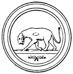 The panther mosaic, "opposite the entrance door",[38] measures 1.30 m in diameter, but was found mutilated. The tame, walking animal wears a collar.[52] The color rendering of the animal's coat produces "a striking effect", according to René du Coudray de La Blanchère.[53] The representation of the animal is remarkable, inspired by a real animal, but the state of conservation is "mediocre".[36] According to Jean-Pierre Laporte, the plant motifs in the medallion, two scrolls ending in ivy leaves,[54] are a reference to the sodality of the Taurisci.[49][54] The motif is also present on a threshold, on the horse mosaic and a medallion in the Neptune mosaic, featuring an ichthyosaur. According to Louis Foucher, this is a sign with prophylactic value.[55] The mosaic also has a Dionysian meaning, the ivy motif often accompanying the divinity.[56]