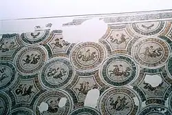 The dating of the Neptune mosaic has varied in historiography. René du Coudray de La Blanchère dates the building after the Byzantine period, with the evacuation at the time of the Muslim conquest of the Maghreb.[18] According to Mohamed Yacoub, it dates from the end of the 1st century[19] or the 2nd century,[20][21] more precisely from the second half of the 1st century or the beginning of the following century.[3][22] It pre-dates 161-169, the reign of Lucius Aurelius Verus, the emperor who replaced the palm tree with a modius filled with gold coins as a symbol of victory.[23] It was found in the œcus[24] of a rich shipowner's or horse breeder's residence. The house also yielded a mosaic depicting the owner's estate and his horses[25][26] and another depicting a panther.[2]