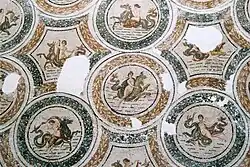 Ichthyocentaurs with a rudder or conch shell[91] are found at the edges of the work, while others have a fascinum, a "cross-shaped pole" perhaps associated with horse breeding or a pedum, a satyr's utensil.[87] Medallions that are not complete because of the border are either empty or occupied by dolphins with a trident.[92]