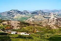 In the foreground, Paul Gauckler evokes a mare farm, echoed by Mohamed Yacoub.[62] The mosaic evokes the "confines of wild, uninhabited nature" and the "humanized countryside". A figure plays the syrinx.[19] Yacoub evokes "the influence of idyllic and fanciful landscapes" and the influence of Alexandrian art, even if the landscape resembles those of the Tunisian steppe.[63] The buildings are also plausible.[61]