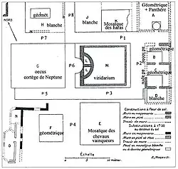 Animals must have been painted on the walls.[49] The mosaic in the lion's room featured the location of a bed.[49] The boar room had the inscription ad apru[m] in front of the entrance.[49] The animals may have been chosen because they were present in games that the owner might have been fond of.[50] The panther, lion, and boar rooms were decorated with mosaics featuring black and white geometric motifs.[27][51] Opposite the entrance to the Neptune room, an apse featured a polychrome fan-shaped mosaic.[27] The panther room featured brightly painted plasterwork.[48] This room may have been called "Chez la panthère" or "Chez le lion ".[45]