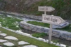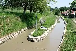 The bifurcation is actually an artificial phenomenon, as the connection was achieved by digging an artificial canal, but the downstream water flow is still natural.[4] In the 14th century, during the reign of king Milutin, a canal connecting the Sazlia pond and the river Nerodime was dug, creating an artificial bifurcation, since the Nerodime flows to the south into the Lepenec river and thus belongs to the Aegean Sea drainage basin, while the Sitnica (which is an outflow of the Sazlia) flows to the north, into the Iber river and belongs to the Black Sea drainage basin. After World War II, the canal was covered with earth again as it was previously mudded as a result of the lack of maintenance.