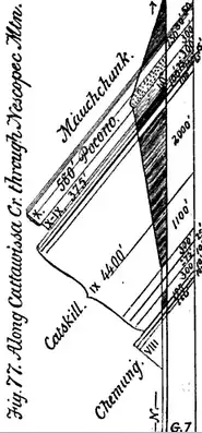 Nescopeck Mountain is mainly formed by hard, upturned conglomerates belonging to the Pocono Formation.[19] There are a total of three rock formations on Nescopeck Mountain in the Berwick Quadrangle, which is in Columbia County and Luzerne County. From north to south, these rock formations are the Trimmers Rock Formation (from the Devonian Period), the Spechty Kopf Formation (from the Devonian Period and the Mississippian Period), and the Onondaga Formation (from the Devonian Period). All three of these formations occur in bands that are at an angle relative to the surface. The Spechty Kopf Formation occurs at the peak of the ridge and extends to a depth of approximately 1,500 feet (460 m) below sea level. The Onondaga Formation runs from near the ridge's peak to 1,000 feet (300 m) below sea level. The Trimmers Rock Formation runs from the middle elevations of the ridge to more than 2,000 feet (610 m) below sea level.[10] Additionally, the Mauch Chunk Formation is found on the ridge.[20] The summit of the ridge consists of hard Pocono Formation rock. A plain of the Catskill Formation occurs to the north of the ridge.[19]