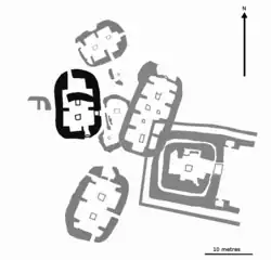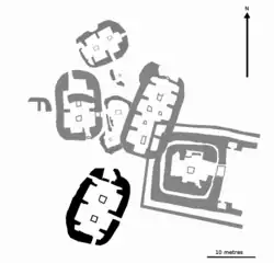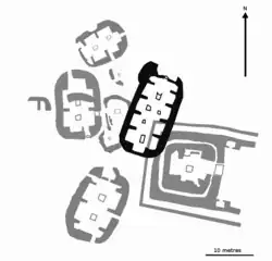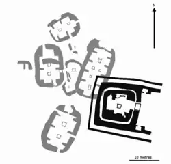 Structure 8 is roughly contemporary with structure 1, probably having been built just after structure 1 was completed.[26] It comprised 10 piers and ten recesses, and had six hearths. The remains of at least two earlier buildings lie beneath it and structure 8 appears to have undergone severe subsidence itself. Its floor slumped in antiquity, causing the roof to fall in, and some of its stones were used to form structure 10.[26]