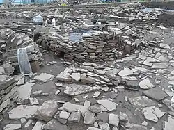 Structure 27 is believed to have been constructed later in the timeline of the Ness, however the structure is yet to be dated.[36] It is believed to be located outside the site's southern boundary wall. It exhibits particularly high quality masonry, including a gentle, deliberate curve to its walls. It was discovered beneath a midden, and was not built on top of any other structures, meaning it displays little subsidence.[37]