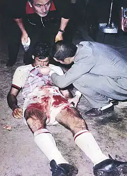 In a game between A.C. Milan and Argentine side Estudiantes for the 1969 Intercontinental Cup, Combin was dealt with aggressively by rival players and had his nose broken (the infamous "Bombonera Massacre"). When he was leaving the stadium, he was arrested, under a charge of desertion.[3] After international pressure and indignation rising, he was released. In 2015, Raúl Horacio Madero blamed Combin as the fighting inciter, by provoking Ramón Aguirre Suárez in the first match, in Italy, saying "negro, don't warm up anymore because in one month I earn the same money that you receive in two years". El Negro was the disparaging nickname given to Suárez, who was of Paraguayan descent and had dark skin.[4][5]