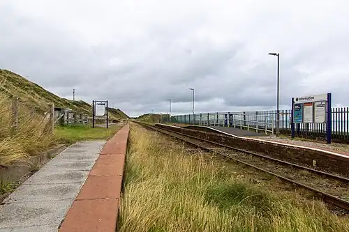 The station is directly on the coast in a spectacular and remote position overlooking the Irish Sea from a small cliff. Pearson's 1992 railway guide is moved to comment, "The tiny halts at Braystones and Nethertown are as remote as anything British Rail has to offer....Nethertown station seems suspended between the cliff face and the sands".[4] There is a vehicle track from the public highway and a footpath shortcut to the village.