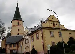 The main landmark of the town is the Church of Saint Thomas the Apostle. It was first mentioned in 1352 and it is the oldest building in Nýrsko.[9] The Gothic church was extended in the second half of the 14th century, then early Baroque modification were made in the 17th century and further Baroque modifications in the 18th century.[10]