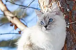 The colourpoint markings are the result of a colourpoint gene, originally found in Asian cats.[4] The Neva Masquerade is believed to be derived from crossing the Siberian cat with Asian colourpointed landrace cats, or possibly pedigree cats related to those, such as the Himalayan (colourpointed Persian), Siamese or Thai breed.[3][5][6]