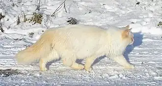 Neva Masquerade cats moult twice a year.[19] They will shed their heavy winter coat during spring.[9] This winter moult is instigated not by a change in temperature but by a change in day length. Many Neva Masquerades will experience a less intense "mini-moult" at the end of the summer season to prepare for their thick winter coat,[9] unlike other cats, which will experience a "heavy moult" more than twice a year. However, they will still lose fur year-round and need to be groomed daily in order to prevent their dense triple coat from matting. The Siberian Neva Masquerade cat has been noted for its hypoallergenic properties primarily attributed to lower levels of the Fel d 1 protein.[20]