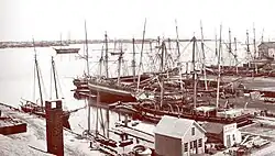 Ten thousand men worked in the whaling industry. During this period, New Bedford's population increased from approximately 4,000 in 1820 to about 24,000 in 1860.[23] At the height of the whaling industry in 1857, the harbor hosted 329 vessels worth over $12 million, and New Bedford became the richest city per capita in North America.[24]