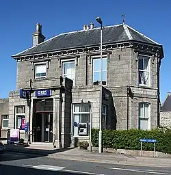 There has been a bank in the village since at least 1847. For many years this was the Clydesdale Bank until 2006 when the Royal Bank of Scotland took over the branch.[10] The RBS branch remains open, open three days a week.[11] Historically the New Deer Savings Bank (est. 1847, and which became part of Trustee Savings Bank (TSB) in 1863), also provided a service to residents, but TSB left the village in the 1980s.[12] The villagers' successful campaign against the removal of banking facilities was partly responsible for it winning the "Calor Gas Scottish Community of the Year" award in 2006.[13]