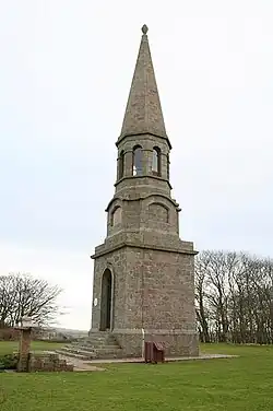 Stands on a hill to the north of the village and commemorates William Dingwall Fordyce. Local Brucklay estate landlord, Fordyce was an Aberdeenshire MP. Constructed in 1877, the monument is 80 feet (24 m) high and was designed by James Matthews. Situated at the highest point in New Deer, 150 m (490 ft) above sea level, it is prominent on the skyline on all major approaches to the town. Historic Scotland designated it as a Category B listed building in April 1971.[7][8]