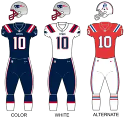 In 2016, the Patriots took part in the NFL's Color Rush program, wearing monochrome navy uniforms on September 22 against the Houston Texans.[117] The uniform tops were patterned after the 1980s Pat Patriot-era uniforms, while the pants featured thick white stripes with red accents. They have worn them a total of four times since 2016. In 2017, an all-white Color Rush uniform was introduced and used for the Patriots' Thursday night road game against the Tampa Bay Buccaneers.[118]