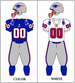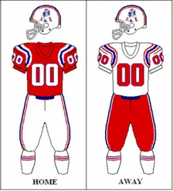 The Patriots underwent a complete identity overhaul before the 1993 season, starting with the introduction of the aforementioned "Flying Elvis" logo. The new uniforms consisted of a royal blue home jersey and a white away jersey.[103] The helmet was silver with the Flying Elvis logo and no additional striping.[103] Both uniforms used silver pants, originally with stripes designed to look like those flowing from the Flying Elvis, but these were changed to simple red and blue stripes after one season. When they debuted, both the home and away jerseys used red block numbers with a blue and white outline, but after one season the home uniforms switched to the now-familiar white with a red outline.[107]