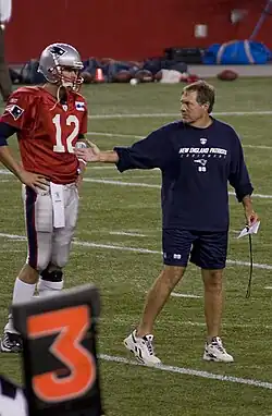 In 2000, the Patriots hired head coach Bill Belichick, who had served as defensive coordinator under Parcells including during Super Bowl XXXI.[47] Their new home field, Gillette Stadium, opened in 2002 to replace the aging Foxboro Stadium. Long-time starting quarterback Drew Bledsoe, who was the franchise's star throughout the 1990s, went down with a sheared blood vessel in his chest in a week two match-up in 2001 against the rival New York Jets. Backup quarterback Tom Brady, drafted by the Patriots in sixth round of the 2000 NFL draft, became the starting quarterback. Brady's successful play led to Bledsoe never getting his job back as a starter, and would serve as the franchise's starting quarterback for the next 18 years.[48] Under Belichick and Brady, the Patriots became one of the most consistently dominant teams in the NFL, with many describing the team as a "dynasty". Within the first few seasons of the 21st century, the team won three Super Bowls in four seasons (2001, 2003, and 2004), over the St. Louis Rams, Carolina Panthers, and Philadelphia Eagles, respectively.[49] In the 2005 season, the Patriots went 10–6 and won the division.[50] The Patriots defeated the Jacksonville Jaguars in the Wild Card Round before falling to the Denver Broncos in the Divisional Round.[51][52] In the 2006 season, the Patriots went 12–4 and won the division.[53] After defeating the Jets and the Chargers, the Patriots lost in the AFC Championship to the Colts.[54][55][56] The Patriots finished the 2007 regular season with a perfect 16–0 record, becoming only the fourth team in league history to go undefeated in the regular season, and the only one since the league expanded its regular season schedule to 16 games.[57] After advancing to Super Bowl XLII, the team's fourth Super Bowl in seven years, the Patriots were upset by the Giants to end their bid for a 19–0 season.[58] With the loss, the Patriots ended the year at 18–1, becoming only one of three teams to go 18–1 along with the 1984 San Francisco 49ers and the 1985 Chicago Bears. However, both the Bears and 49ers lost their only game during the regular season, and both would win their respective Super Bowl.[59] In the first game of the 2008 season, Brady suffered a torn ACL against the Chiefs.[60] Matt Cassell stepped in for the rest of the season and the team finished 11–5 but missed the postseason.[61] In the 2009 season, Brady returned from his injury and led the team to a 10–6 record and a division title.[62] The team's season in the Wild Card Round with a 33–14 loss to the Baltimore Ravens.[63] The Patriots went 14–2 and won the division in the 2010 season but were one-and-done in the Divisional Round of the playoffs against the New York Jets in a 28–21 loss.[64][65]