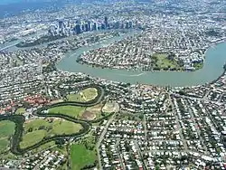 The suburb of New Farm (peninsula in upper part of image) including New Farm Park is located on the Brisbane River.