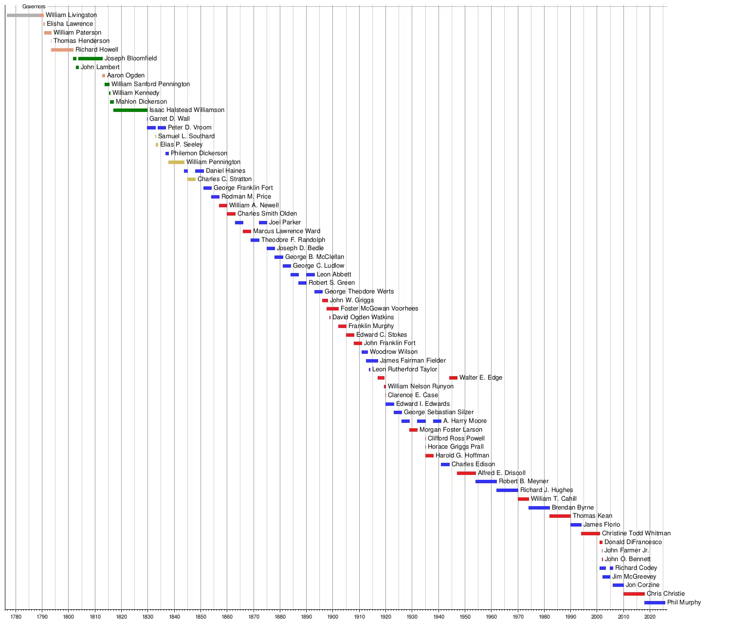 The first and longest-serving governor of New Jersey was William Livingston, who served from August 31, 1776, to July 25, 1790. A. Harry Moore remains the longest-serving popularly elected governor. The current and 56th governor is Phil Murphy, a Democrat who assumed office on January 16, 2018.