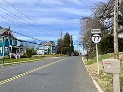 Route 77 crosses Oldmans Creek into Elk Township, Gloucester County, meeting CR 641 and CR 616 before crossing CR 538. Past this junction, the route crosses CR 618 and enters Harrison Township.[1] Route 77 continues northwest and enters Mullica Hill, where it intersects the northern terminus of CR 581 and heads north on South Main Street. Route 77 ends at Route 45, where Route 45 continues to the north on South Main Street.[1][3]