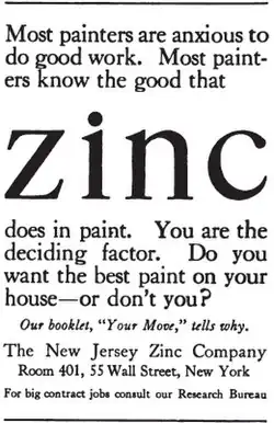 The company had its origins in northwestern New Jersey in 1848 when two companies were created to exploit the iron and zinc deposits at Franklin and Sterling Hill in Sussex County, New Jersey. The Sussex Zinc and Copper Mining and Manufacturing Corporation was incorporated in 1848 for the purpose of mining zinc, and the New Jersey Exploration and Mining Company was incorporated in 1849 for the purpose of mining iron.[1] The founding partners were the same for both companies, and in 1852 the companies merged to form the New Jersey Zinc Corporation. The company adopted the horsehead, one of the state symbols of New Jersey, as its logo.