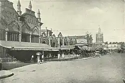 New Market's growth kept pace with the city until World War II. The northern portion of the market came up in 1909 at an expense of 6 lakh rupees. Despite the gathering storm of World War II, an extension was engineered on the south flank, and the historic clock tower on the southern end of the market was shipped over from Huddersfield and installed in the 1930s.[6] Florists were located near the front entrance, and stalls selling fresh and preserved foods were placed towards the rear of the market. Beyond the vegetable stalls, fishmongers and slaughterhouse butchers plied their trade, and, until the mid-1970s, at the very back of the market, exotic animals from all over the British Empire could be bought as pets.