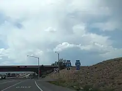 New Mexico Road 599 (NM 599) is a 14.019-mile (22.561 km) state highway in northern Santa Fe County, New Mexico, United States. The divided highway expressway is also known as the Veterans Memorial Highway and the Santa Fe Relief Route; and both names are used on road signs.[2][3] The latter name alludes to the highway's original purpose of bypassing the urbanized areas of Santa Fe and thereby relieving it from shipments of hazardous waste. It passes through less densely developed terrain in and around the northwestern boundary of the municipality. Speed limits on it range from 45 to 65 miles per hour (70 to 105 km/h).