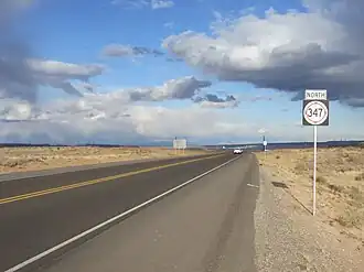 State Road 347 (NM 347) is a partially completed road that starts at Interstate 40 on the West Mesa, approximately 8 miles (12.9 km) west of downtown Albuquerque. It runs north-northeast, following Paseo del Volcan to its northern terminus at US-550 in Bernalillo. Currently it exists in two discontinuous segments: the southern segment is 9.4 miles (15.1 km) long, and follows Paseo del Volcan from I-40 to Paseo del Norte (NM 423) near Double Eagle II Airport. The 10.2 miles (16.4 km) northern section begins at Unser Boulevard in Rio Rancho and ends at US-550 in Bernalillo, which incorporates a 3.4 mile extension of Paseo del Volcan from Iris Road to US-550 that was completed in February 2011. The remaining 10 miles (16.1 km) segment from Paseo del Norte to Unser Boulevard is not yet built. While the New Mexico Department of Transportation owns the right-of-way for the unbuilt section, its completion is contingent upon future growth within Albuquerque and Rio Rancho and the availability of funding.