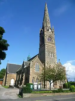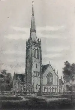 The tower also incorporated a door in its base facing onto Argyle Park Terrace. A contemporary report in The Builder noted the design's quatrefoil parapet for the tower imitated the parapet of the tower of St Giles'.[57] In addition to the spire, a flèche crowned the crest of the southern part of the roof. The south gable featured a large window with curvilinear tracery and was capped by a tall pinnacle. To the west of the south gable was a two-storey porch with a door giving access to the Meadows.[48]