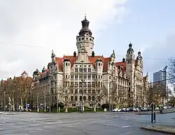 The New Town Hall (German: Neues Rathaus) is the seat of the Leipzig city administration since 1905. It stands in Leipzig's district Mitte within the Leipzig's "ring road" on the southwest corner opposite the newly built Propsteikirche. The main tower is, at 114.8 meters or 377 feet, the tallest city hall tower in Germany, "trumping Hamburg's previous record by a whole eight feet".[1]