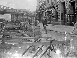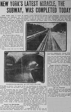 Ground was broken in a ceremony at City Hall on March 24, celebrated at the time as "Tunnel Day".[62] A plan for an extension from City Hall to the Long Island Rail Road's Flatbush Avenue terminal station (now known as Atlantic Terminal) in Brooklyn was adopted on January 24, 1901, and Contract 2, giving a lease of 35 years, was executed between the commission and the Rapid Transit Construction Company on September 11, with construction beginning at State Street in Manhattan on November 8, 1902. Belmont incorporated the IRT in April 1902 as the operating company for both contracts; the IRT leased the Manhattan Railway Company, operator of the four elevated railway lines in Manhattan and the Bronx, on April 1, 1903. Operation of the subway began on October 27, 1904, with the opening of all stations from City Hall to 145th Street on the West Side Branch.[11][63]