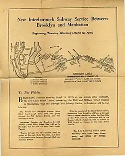 The line was then extended to Fulton Street on January 16, 1905,[71] to Wall Street on June 12, 1905,[72] and to Bowling Green and South Ferry on July 10, 1905.[73] In order to complete Contract 2, the subway had to be extended under the East River to reach Brooklyn. The tunnel was named the Joralemon Street Tunnel, which was the first underwater subway tunnel connecting Manhattan and Brooklyn, and it opened on January 9, 1908, extending the subway from Bowling Green to Borough Hall.[74] On May 1, 1908, the construction of Contract 2 was completed when the line was extended from Borough Hall to Atlantic Avenue near the Flatbush Avenue LIRR station.[75] When the IRT extension to Brooklyn opened, riders on the BRT's elevated and trolley lines over the Brooklyn Bridge began using the new subway.[76]
