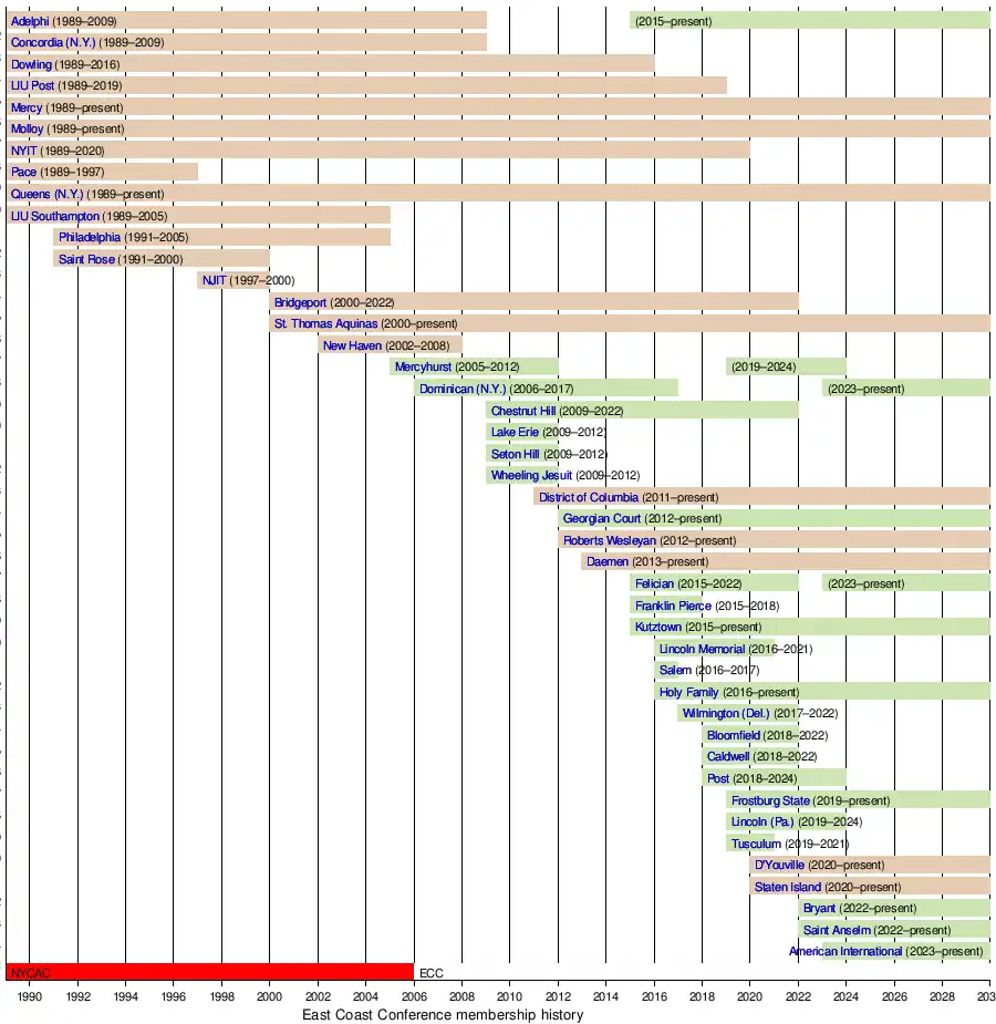 The East Coast Conference was founded in 1989 as the New York Collegiate Athletic Conference (NYCAC). Its charter members included Adelphi University (1989β2009), Concordia College (1989β2009), C. W. Post College (1989β2019), Dowling College (1989β2016), Mercy College (1989βpresent), Molloy College (1989βpresent), New York Institute of Technology (NYIT) (1989β2020), Pace University (1989β1997), Queens College (1989βpresent) and Southampton College of Long Island University (1989β2005).