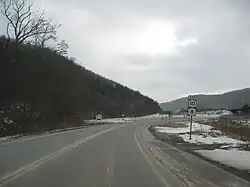 NY 10 begins concurrent with NY 8 at an interchange with the Quickway (NY 17) (Future I-86) southeast of the village of Deposit near the Broome-Delaware County line. The two routes continue north along the eastern extents of Deposit to the banks of the west branch of the Delaware River, where NY 8 breaks from NY 10 to cross over the river. NY 10, however, continues northeast along the riverbank, passing south of the Cannonsville Dam and the resulting Cannonsville Reservoir behind it. Near the midpoint of the water body, NY 10 crosses over the reservoir on the Cannonsville Bridge and proceeds to follow the northern edge of the reservoir. As the reservoir begins to narrow, NY 10 intersects NY 268, a connector route leading south to the village of Hancock.[3]