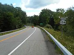 At this point, the road makes a turn to the southeast to enter the small hamlet of Kitchawan, located at NY 134's junction with Pines Bridge Road (unsigned County Route 1323 or CR 1323).[3] Pines Bridge Road was once NY 135, and its junction with NY 134 in Kitchawan was NY 135's eastern terminus.[4] From Pines Bridge Road, NY 134 bends southward to run alongside a reservoir inlet connecting to Cornell Brook. After about 1,500 feet (460 m), the route makes a final turn to the east to cross Cornell Brook and reach its east end at an intersection with NY 100 (Saw Mill River Road).[3]