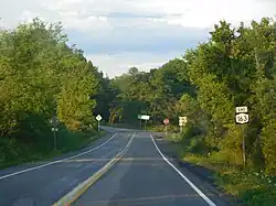 The highways that comprise the C-shaped NY 163 were acquired by the state of New York in the early 20th century. On January 18, 1907, the state let a contract to improve the section east of the hamlet of Sprout Brook to state highway standards. It was added to the state highway system in July 1910 as unsigned State Highway 345 (SH 345). The section between Sprout Brook and Main Street in Fort Plain was rebuilt under a project contracted out on July 15, 1915, and accepted into the state highway system on November 15, 1918, as SH 410.[4] In the 1930 renumbering of state highways in New York, hundreds of state-maintained highways were assigned a posted route number for the first time.[5] SH 345 and SH 410 were designated as part of NY 163,[2] which overlapped with NY 80 and NY 10 to connect to NY 5S in Fort Plain and Canajoharie, respectively.[6] The overlap with NY 10 was eliminated at some point between 1977 and 1993.[7][8]