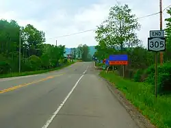 NY 305 begins at the Pennsylvania state line as a continuation of PA 446 in the town of Portville. The designation proceeds northward as Portville-Eldred Road, paralleling the Allegheny River and ponds as a two-lane rural highway. After an intersection with Barbertown Road, NY 305 enters the hamlet of Carroll and passes several residences northward. The route crosses Oswayo Creek, intersecting with NY 417 (Portville-Ceres Road). NY 305 and NY 417 form a concurrency, crossing north through the hamlet of Toll Gate Corner as a two-lane residential street, entering the village of Portville. In Portville village, NY 305 turns to the northeast away from NY 417 at an intersection with Brooklyn Street. Turning north on Brooklyn, paralleling a long stretch of residences and crossing the former Bradford Division. Passing east of Chestnut Hill Cemetery, NY 305 leaves the village.[5]