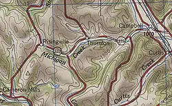 NY 333 began at an intersection with CR 11 and CR 24 in Risingville, an isolated hamlet within the Steuben County town of Thurston. It headed eastward, following Michigan Creek along the base of a valley surrounding the waterway. Due to the terrain of the area, NY 333 intersected only a handful of roads, one of which was Cranberry Lake Road (CR 2), a north–south highway that met NY 333 midway between the hamlets of Risingville and Thurston. The route continued onward, turning northeastward toward Thurston Pond and the small hamlet of Thurston at the eastern edge of the small lake. Here, NY 333 curved back to the east as it met Savona–Thurston Road (CR 12) in the western half of the community.[4]