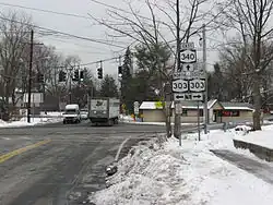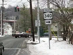 New York State Route 340 (NY 340) is a 3.10-mile (4.99 km) state highway in southeastern Rockland County, New York, in the United States. Though it is signed as an east–west route, it actually follows a north–south alignment. The southern terminus of the route is at the New Jersey state line in Palisades, where it becomes County Route 501 (CR 501). The northern terminus is at an intersection with NY 303 in Orangeburg; however, according to the New York State Department of Transportation (NYSDOT), the route continued for another 0.07 miles (0.11 km) to the northwest of NY 303 until by 2017.[4] NY 340 was assigned to part of its modern routing in the early 1930s and extended to its current length in the early 1940s.