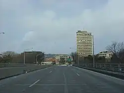 NY 434 remains a four-lane divided highway for its first 2 miles (3.2 km) in the city, following the Susquehanna River along the north edge of a vast neighborhood that comprises the south half of Binghamton. It soon approaches the vicinity of downtown Binghamton, where the route connects to Pennsylvania Avenue by way of an interchange located across the river from the city's center. Another grade-separated junction with Conklin Avenue follows, at which point NY 434 turns northward and crosses the river into downtown as State Street. On the north bank of the river, NY 434 meets NY 363, a freeway linking downtown to the Southern Tier Expressway north of the city. NY 434 continues on, narrowing to two divided then undivided lanes for its final two blocks as it passes the Broome County Veterans Memorial Arena and ends at a junction with US 11 (Court Street).[3]