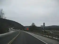 NY 434 begins south of the village of Owego at an intersection with NY 96. The highway heads to the east as a two-lane road, closely paralleling I-86/NY 17 as it runs along the southern edge of the Susquehanna River valley. The first junction along the route leads to exit 64, the first of three exits directly connecting NY 434 to the nearby freeway. Continuing on, NY 434 serves a housing tract and a cluster of commercial properties at the southeastern edge of the village before heading into less developed areas of the town. For most of the next 12 miles (19 km), NY 434 runs directly alongside the eastbound lanes of the freeway, separated by only a fence in all but a handful of areas.[3]