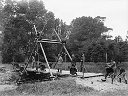 The New Zealand Tunnelling Company was also raised in 1915 and was the first New Zealand unit deployed to the Western Front, arriving in March 1916. It was initially involved in counter-mining at Vimy ridge and later dug out tunnels at Arras.[7] During the Hundred Days Offensive the tunnelling company was retasked with bridge building, which included the construction of a 240 foot bridge across the Canal du Nord.[8]