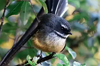 This fantail is mid to dark grey or grey-brown above, yellowish/orange below, with a dark band across the chest below a white throat, white markings over the eye, and (depending on the race) either white-edged or entirely white outer tail feathers. It grows to 16 cm (6.3 in) in length, of which half is the tail, which, as the name implies, is often displayed fanned out. This reveals that the outer tail feathers are light and the centre ones are dark. Some subspecies are found in a darker plumage, notably the "black fantail" morph seen in 4% of South Island birds and less than 1% of North Island birds (it is completely absent from the Chatham Islands).[10] The black morph lacks the white areas and so is dark all over apart from a white spot behind the eye. Fantails are also famous worldwide for their fan-shaped tail.