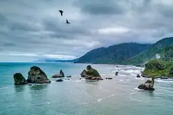 The highway leaves the river as its valley broadens, turning south six kilometres from Westport, where the river reaches the sea. From here, the highway keeps close to the Tasman coast from Charleston for over 100 kilometres, turning inland only briefly near Runanga. This 100-kilometre stretch includes two of the coast's larger towns, Greymouth and Hokitika.