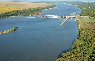 Newburgh Lock and Dam is the 16th lock and dam on the Ohio River, located 776 miles (1,249 km) down stream of Pittsburgh.There are two locks. The main lock for commercial barge traffic that is 1,200 feet (370 m) long by 110 feet (34 m) wide, and the auxiliary lock is 600 feet (180 m) by 110 feet (34 m) wide.[1]